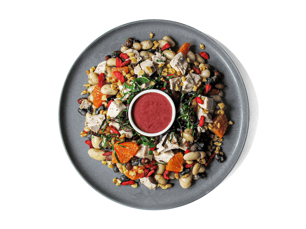 Tender Organic chicken breast over a hearty wild rice and wheat berry pilaf with butternut squash, gigante beans, and herbs. Topped with sweet Frog Hollow apple pears, tangy pickled onions, and crumbled Laura Chenel goat cheese. Served with kale and a bright passionfruit vinaigrette, plus a side of toasted walnuts, pine nuts, and flax seeds for crunch and omega-rich goodness. High in protein and fiber, this vibrant bowl supports energy, digestion, and longevity.