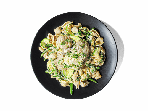 $0.00Tender black cod over chickpea pasta, green beans, and cannelloni beans, all tossed in a velvety Calabrian chili lemon cream made with spinach and parmesan. Balanced with fresh zucchini, lemon zest, and a touch of Grana Padano. High in protein and rich in omega-3s—made to fuel longevity without sacrificing flavor.Spice LevelHotIngredientsCalabrian Lemon Cream with spinach (low fat organic greek yogurt, grass fed cream, Organic spinach, baby, parmesan, cottage cheese, White wine, Shallots minced, calabrian chilies minced, lemon juice, Avocado/EVOO blend, garlic minced, anchovy smashed and minced, pepper, black, salt), Banza shells chickpea pasta, Organic green beans, Organic zucchini, wild alaskan Black Cod, Organic lemon zest and parsley, Grana Padano cheese. Allergens: Dairy, FishNutrition InfoCalories723cal37%