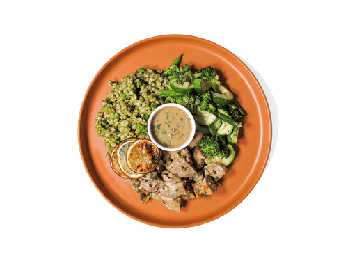 $12.00Tender green tea–infused chicken is tossed in a bright, buttery piccata sauce and served alongside barley risotto with spinach and peas. Paired with roasted broccoli, crisp green beans, and caramelized lemon slices, this dish balances rich flavor with antioxidant-packed ingredients and lasting, high-protein fuel.Product Highlights
