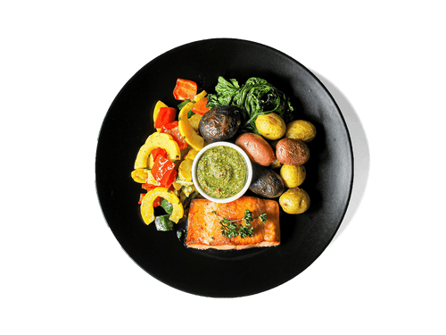 The % Daily Value (DV) tells you how nutrients from this meal contribute to a daily diet of 2,000 calories a day. Your daily values might be higher or lower depending on your calorie needs.Browse all productsHeating InstructionsOur 'Fresh Seal' packaging keeps this meal fresh for 4 after delivery.This meal arrives chilled and packaging is microwave safe.What people loved about this dishWild King Salmon Platewith Organic Marble Potatoes, Veggie Medley and ChimichurriPescatarian$14 -