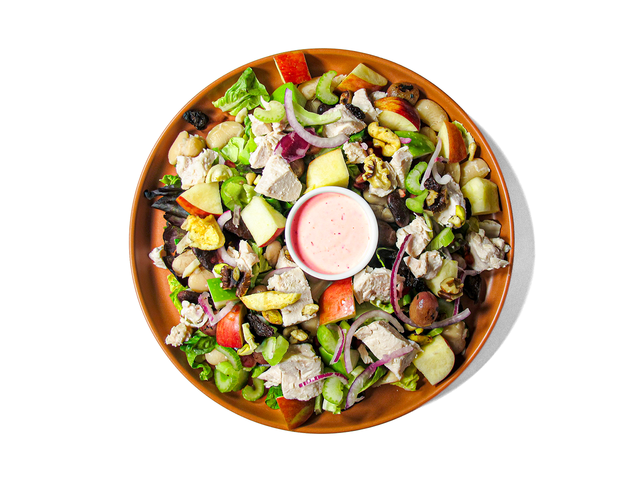 with Edamame and Spicy Roasted Peanuts599 Cal51g Protein29g Carbs31g Fat0Thai Peanut Organic Chicken SaladThai Peanut Organic Chicken Salad with Edamame and Spicy Roasted PeanutsA bold and refreshing Thai Peanut Chicken Salad loaded with high-protein edamame, crisp romaine, red cabbage, and juicy tomatoes. Tender chicken is drizzled with a rich Thai peanut dressing, while crunchy, spicy roasted peanuts add the perfect kick. A vibrant mix of flavors and textures, this nutrient-packed salad is as satisfying as it is delicious!
