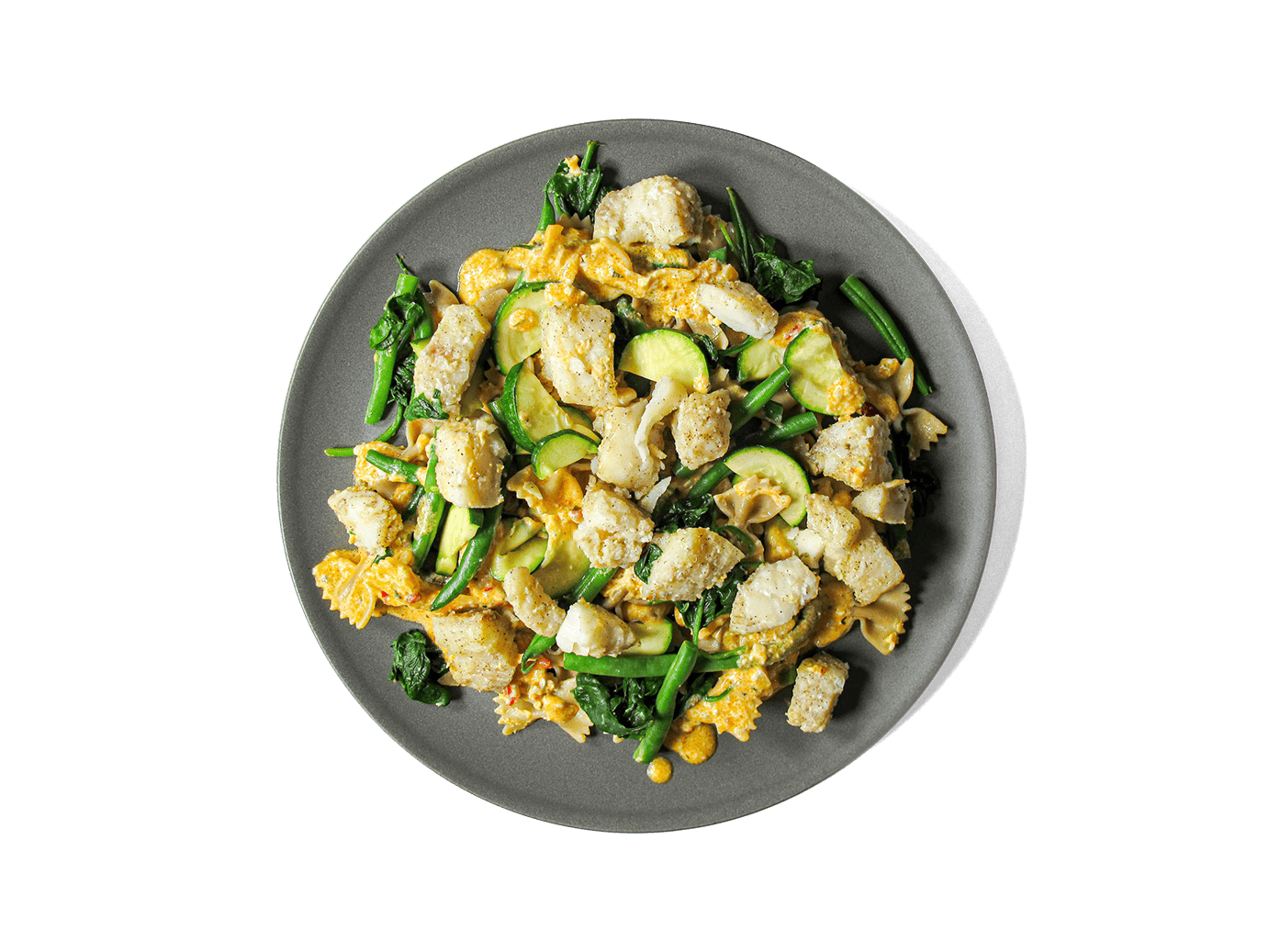 Calabrian Lemon Cream with spinach (avocado/EVO blend, Organic shallots, Organic garlic, calabrian chilies, anchovy, white wine, lemon juice, heavy cream, cottage cheese, parmesan, Organic baby spinach, black pepper, salt), pasta durum wheat cavatapi, Organic Canneloni Beans, Organic green beans, Organic zucchini, wild Black Cod, Organic lemon zest and parsley, Grana Padana shaved