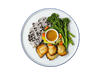 Wild black cod (wild black cod, sake, mirin, white miso paste, organic coconut sugar, kosher salt), organic sesame broccoli rabe (organic broccoli rabe, sesame oil, toasted sesame seeds, white pepper), organic speckled sushi rice (purple sticky rice, sushi rice, sesame oil), organic edamame, ponzu, organic pickled carrot, daikon and cucumber (pickling liquid, organic carrot, organic cucumber, organic daikon). Allergens: Fish, Sesame, Soy