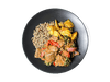 Grass-fed steak (sirloin, coconut aminos, garlic minced, red wine vinegar, Avo/EVO blend, paprika, cumin, salt, black pepper, lomo saltada sauce), organic stir fry vegetables (tomato wedges, organic red onions, organic baby spinach, organic red bell peppers, organic yellow bell peppers, organic cilantro, lomo saltada sauce), lomo saltada sauce (organic beef broth, coconut aminos, red wine vinegar, ginger minced, garlic fresh minced, dijon, arrowroot), organic aji amarillo yukon potatoes (organic yukon potatoes, aji amarillo paste, avocado oil, salt, pepper), organic rainbow quinoa. Allergens: Beef